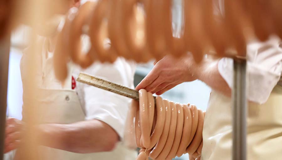 Brühwurst machen wir aufwendig und ganz traditionell mit Warmfleisch. Dabei werden die Rinderviertel schlachtwarm zerlegt und verarbeitet. Das warme Fleisch hat optimale Verarbeitungseigenschaften und verleiht der Wurst Biss und einen kräftigen Fleischgeschmack.